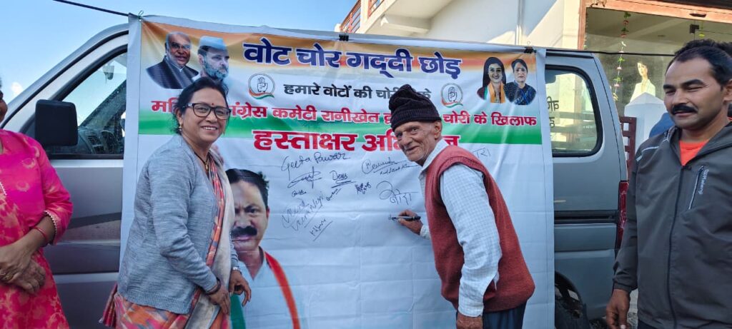 महिला कांग्रेस रानीखेत के तत्वावधान में शक्ति चौक, वार्ड नंबर 4, चिलियानौला में “वोट चोर गद्दी छोड़” हस्ताक्षर अभियान आयोजित किया गया।
