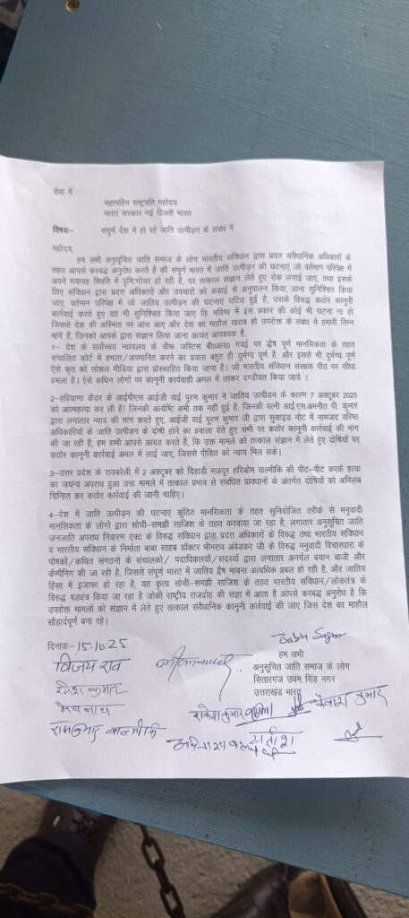 ज्ञापन में कहा गया कि सर्वोच्च न्यायालय के चीफ जस्टिस बी. आर. गवई पर द्वेषपूर्ण मानसिकता के तहत कोर्ट में हमला करने का प्रयास बेहद निंदनीय है। इसके साथ ही राजस्थान में आईपीएस अधिकारी पूरन कुमार द्वारा जातीय उत्पीड़न से तंग आकर आत्महत्या करना, जिसकी अभी तक अंतिम संस्कार की प्रक्रिया भी पूरी नहीं हुई है, दलित समाज को झकझोर देने वाली घटना है।