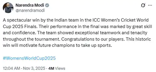 वर्ल्ड कप फाइनल में ऐतिहासिक जीत के बाद प्रधानमंत्री नरेंद्र मोदी ने सोशल मीडिया पर भारतीय टीम को बधाई दी थी। उन्होंने लिखा था — “विमेंस क्रिकेट वर्ल्ड कप 2025 के फाइनल में भारतीय टीम की शानदार जीत। टीम ने पूरे टूर्नामेंट में अद्भुत कौशल, आत्मविश्वास और एकजुटता दिखाई। यह ऐतिहासिक जीत भविष्य की पीढ़ी को प्रेरित करेगी।”