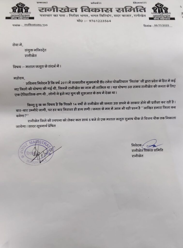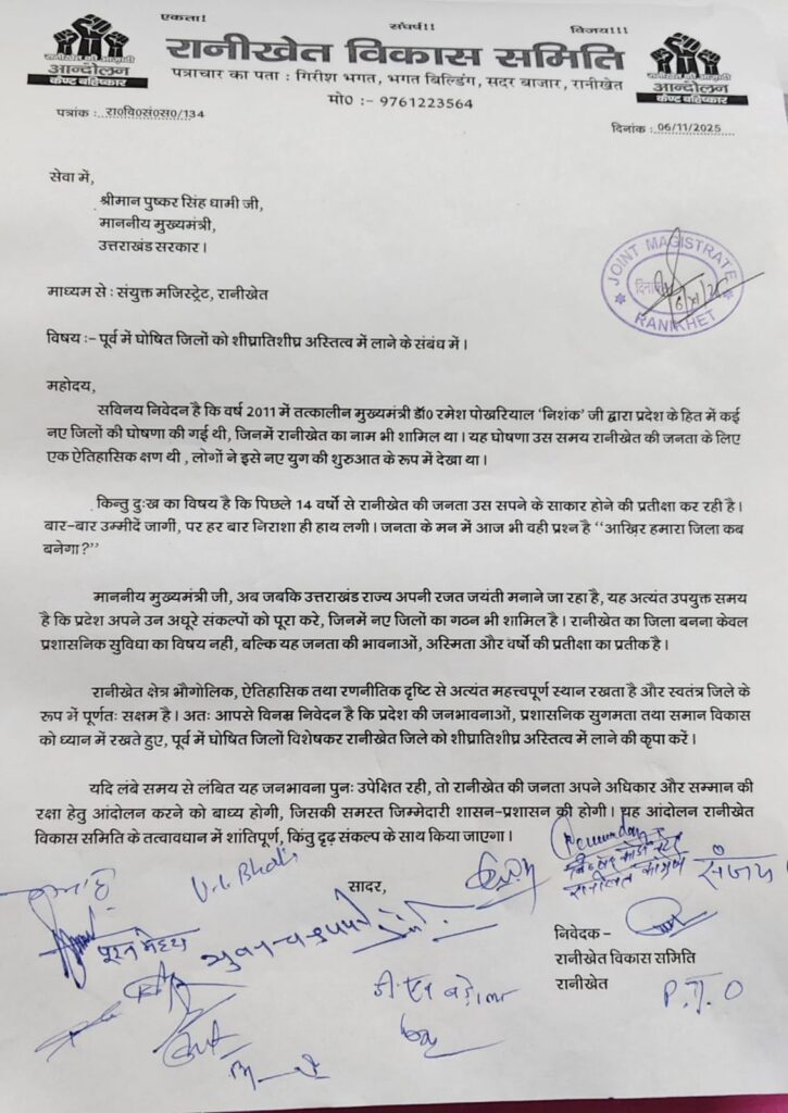 विकास समिति के पदाधिकारियों ने कहा कि वर्ष 2011 में डॉ. निशंक सरकार ने रानीखेत को नया जिला घोषित कर जनता को नई उम्मीद दी थी, लेकिन 14 वर्ष बीत जाने के बाद भी यह घोषणा धरातल पर नहीं उतर सकी। ज्ञापन में कहा गया कि जब प्रदेश अपनी रजत जयंती मना रहा है, तब यह उचित समय है कि राज्य अपने अधूरे संकल्पों को पूरा करे, जिनमें नए जिलों का गठन भी शामिल है।