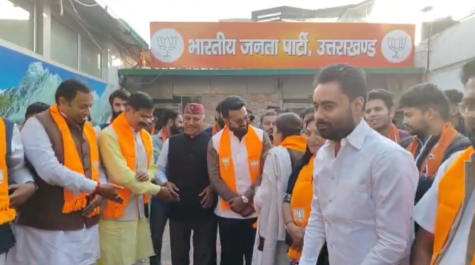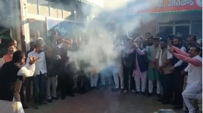 देहरादून भाजपा मुख्यालय में आतिशबाजी, ढोल-नगाड़ों के साथ सीएम धामी का स्वागत