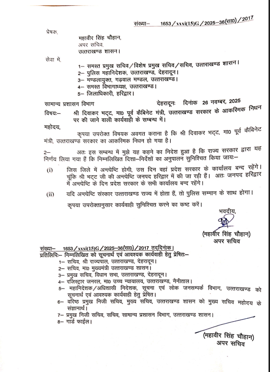 देहरादून। उत्तराखंड राज्य सरकार ने आदेश जारी किया है कि पूर्व कैबिनेट मंत्री और दिग्गज राज्य आंदोलनकारी के निधन पर प्रदेश के सभी सरकारी कार्यालय बंद रहेंगे।
