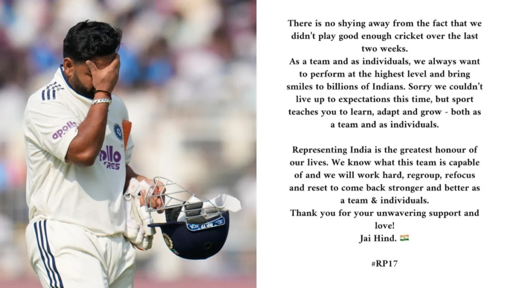 इन हारों के बाद खिलाड़ियों और फैंस दोनों ही बेहद निराश नजर आए। टीम इंडिया के कई खिलाड़ियों को आलोचना का सामना करना पड़ रहा है। इस बीच गुवाहाटी टेस्ट में शुभमन गिल की जगह कप्तानी कर रहे ऋषभ पंत ने सोशल मीडिया पर एक भावुक पोस्ट साझा किया है, जिसने फैंस का ध्यान खींच लिया है।