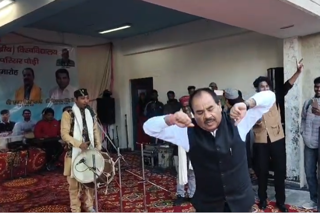 पौड़ी। बीजीआर परिसर में आयोजित छात्र संघ उद्घाटन समारोह में पूर्व कैबिनेट मंत्री डॉ. हरक सिंह रावत ने मंच पर अपनी धुन से उपस्थित लोगों का मन मोह लिया। जैसे ही जागरों की थाप सुनाई दी, डॉ. रावत अपने कदम नहीं रोक पाए और ढोल की धुन पर थिरकने लगे।