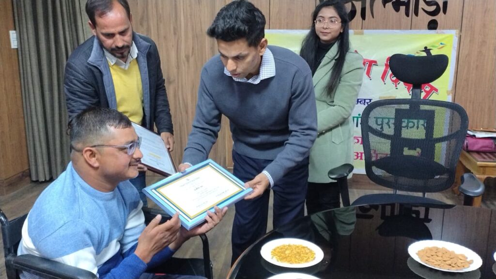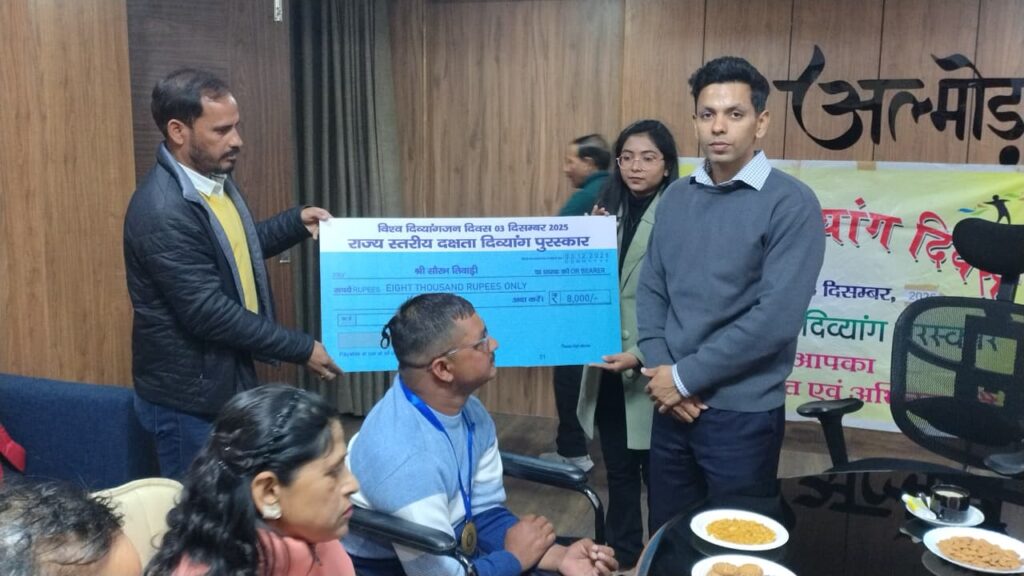 राज्य स्तरीय पुरस्कार के लिए जनपद अल्मोड़ा से कुल 4 दिव्यांगों का चयन हुआ था। कलेक्ट्रेट में आयोजित कार्यक्रम में सौरभ तिवारी, रेखा आर्य और हिमांशु रावत को जिलाधिकारी ने प्रशस्ति पत्र और प्रत्येक को 8 हजार रुपए की सहायता राशि के चेक वितरित किए। जबकि चौथे चयनित अर्चना जोशी को हल्द्वानी में सम्मानित किया गया।