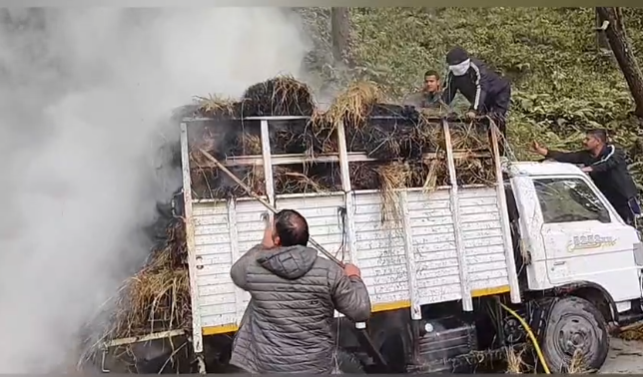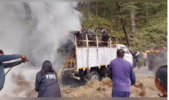 चंपावत जिले के लोहाघाट में रविवार दोपहर करीब 2:30 बजे एक बड़ा हादसा टल गया। कालाकोट से लोहाघाट के राय नगर चौड़ी की ओर सूखी घास ले जा रहे ट्रक में लोहाघाट डिग्री कॉलेज रोड पर पेयजल निगम कार्यालय के पास अचानक आग लग गई। बताया गया कि सड़क किनारे लगे बिजली के पोल से निकली चिंगारी ट्रक में लदी सूखी घास पर गिर गई, जिससे आग भड़क उठी।