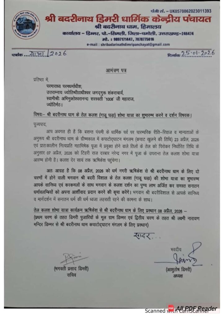 पंचायत अध्यक्ष पंडित आशुतोष डिमरी की ओर से भेजे गए आमंत्रण पत्र में भगवान श्री बद्री विशाल के तेल कलश, जिसे गाडू घड़ा कहा जाता है, के ऋषिकेश से बद्रीनाथ धाम प्रस्थान के दौरान शामिल होने का आग्रह किया गया है। खास बात यह है कि यह न्योता शंकराचार्य के रूप में संबोधित करते हुए भेजा गया है।