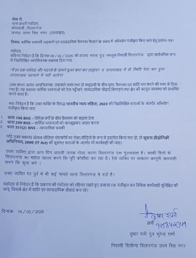 इसी मामले को लेकर सितारगंज महाविद्यालय के पूर्व कोषाध्यक्ष तुषार शर्मा अपने अधिवक्ता मुशीर अहमद और अन्य लोगों के साथ कोतवाली पहुंचे। उन्होंने पुलिस को प्रार्थना पत्र देकर संबंधित व्यक्ति के खिलाफ हेट स्पीच के तहत मुकदमा दर्ज करने की मांग की।