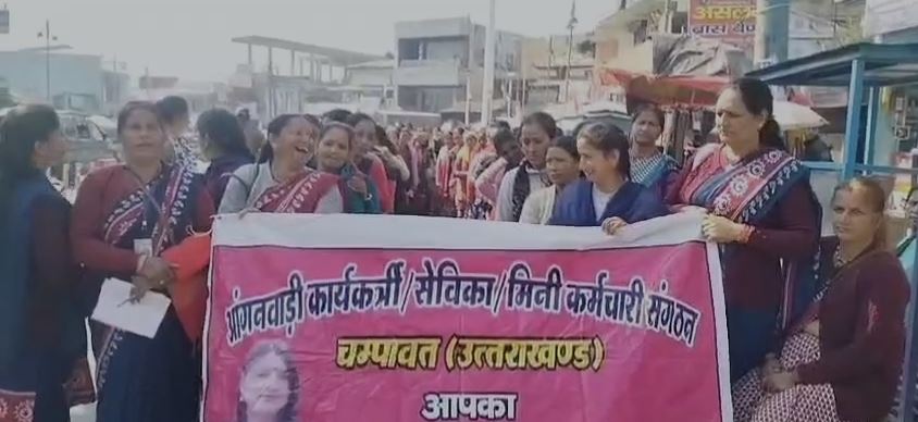 चंपावत जिला मुख्यालय से मोटर स्टेशन रोड से कलक्ट्रेट रोड धरना स्थल तक सैकड़ों आंगनबाड़ी कार्यकर्ताओं ने जोरदार रैली निकाली। रैली में प्रदेश सरकार के खिलाफ नारेबाजी की गई और उनके 11 सूत्रीय मांगों पर त्वरित कार्रवाई की अपील की गई।