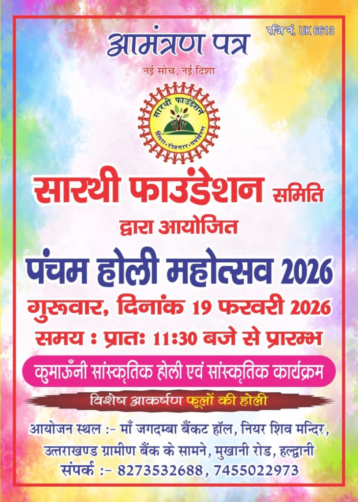 सारथी फाउंडेशन समिति के अध्यक्ष नवीन पन्त ने बताया कि हर वर्ष की भांति इस वर्ष भी पंचम होली महोत्सव 19 फरवरी को आयोजित किया जाएगा। कार्यक्रम सुबह 11:30 बजे से मां जगदम्बा बैंकेट हॉल, शिव मंदिर उत्तराखंड ग्रामीण बैंक के सामने प्रारंभ होगा।
