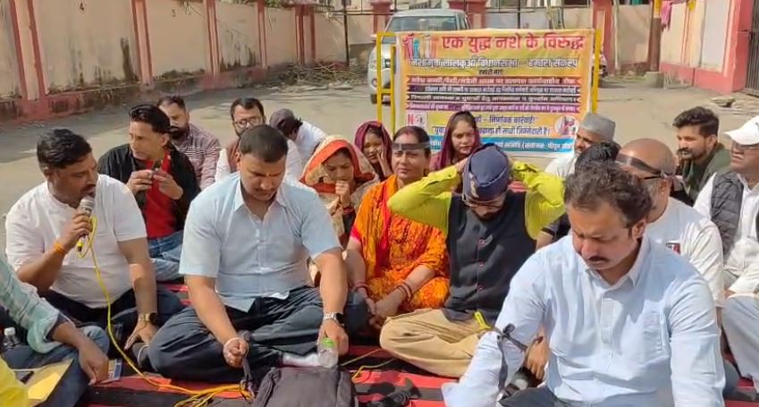 धरना में प्रदर्शनकारियों ने आंख, मुंह और कान पर काली पट्टी बांधकर अवैध कच्ची शराब, स्मैक, चरस और अन्य मादक पदार्थों की बिक्री के खिलाफ अपनी नारेबाजी की।