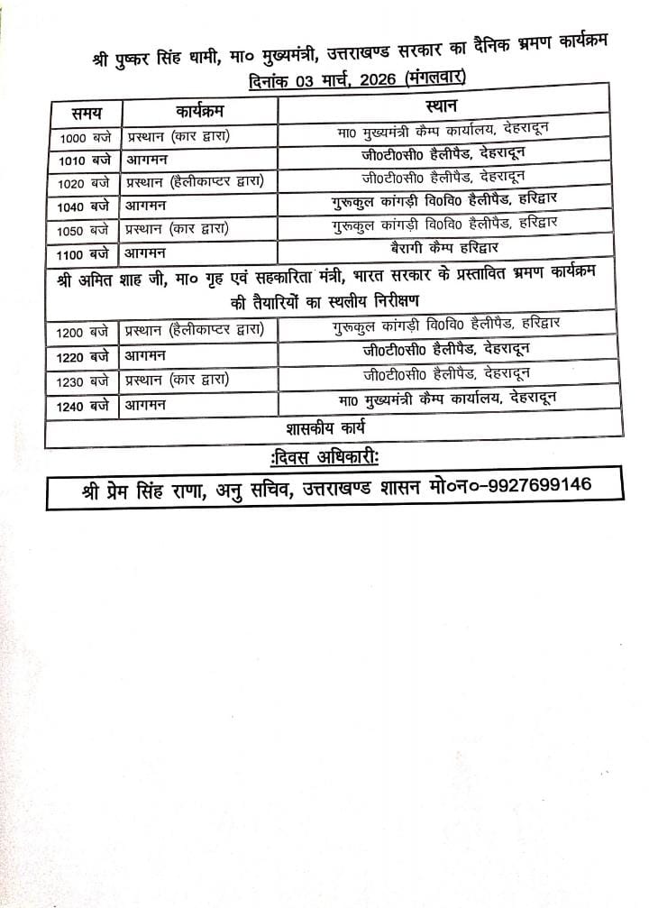 निरीक्षण के बाद मुख्यमंत्री दोपहर में देहरादून लौट जाएंगे। वहां वे अपने पूर्व निर्धारित शासकीय कार्यक्रमों और बैठकों में व्यस्त रहेंगे।