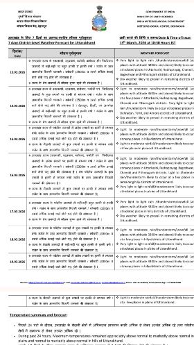 शनिवार 14 मार्च को उत्तरकाशी, रुद्रप्रयाग, बागेश्वर, चमोली और पिथौरागढ़ जिलों में हल्की से मध्यम बारिश के साथ गर्जन और आकाशीय बिजली चमकने का अनुमान है।