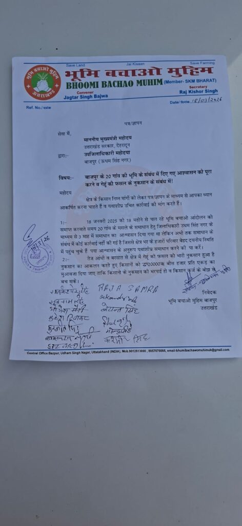 बाजपुर से भूमि बचाओ मुहिम के संयोजक जगतार सिंह बाजवा ने दर्जनों किसानों के साथ मुख्यमंत्री उत्तराखंड को ज्ञापन सौंपा। यह ज्ञापन उप जिलाधिकारी बाजपुर डॉ. अमृता शर्मा के माध्यम से प्रेषित किया गया।