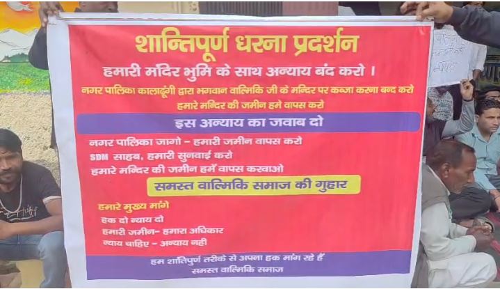 कालाढूंगी नगर पालिका क्षेत्र में वाल्मीकि मंदिर परिसर की जमीन को लेकर विवाद गहराता जा रहा है। इस मुद्दे पर वाल्मीकि समाज के लोगों ने नगर पालिका कार्यालय के बाहर धरना-प्रदर्शन शुरू कर दिया है।