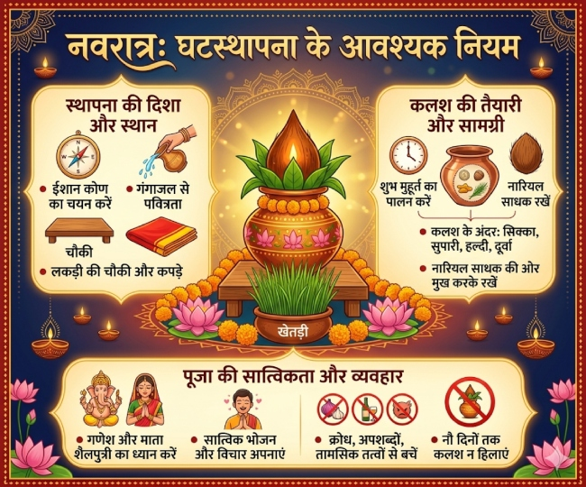 पूजा आरंभ करने के लिए कलश स्थापना जरूरी है। इसके लिए मिट्टी का पात्र और जौ (सप्तधान्य), शुद्ध जल या गंगाजल से भरा कलश, नारियल, कलावा, आम के पत्ते, लाल कपड़ा, सिंदूर, अक्षत और फूल तैयार रखें।