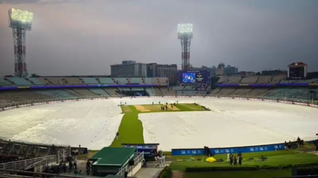 बारिश के कारण मैच तीन घंटे से अधिक समय तक रुका रहा। ढाई घंटे बाद बारिश थमी, लेकिन मैदान पर पानी जमा होने के कारण खेल दोबारा शुरू नहीं हो सका। पूर्व भारतीय कप्तान और बंगाल क्रिकेट संघ के अध्यक्ष सौरव गांगुली मैदान में आए और क्यूरेटर सुजन मुखर्जी से ग्राउंड की स्थिति का जायजा लिया।