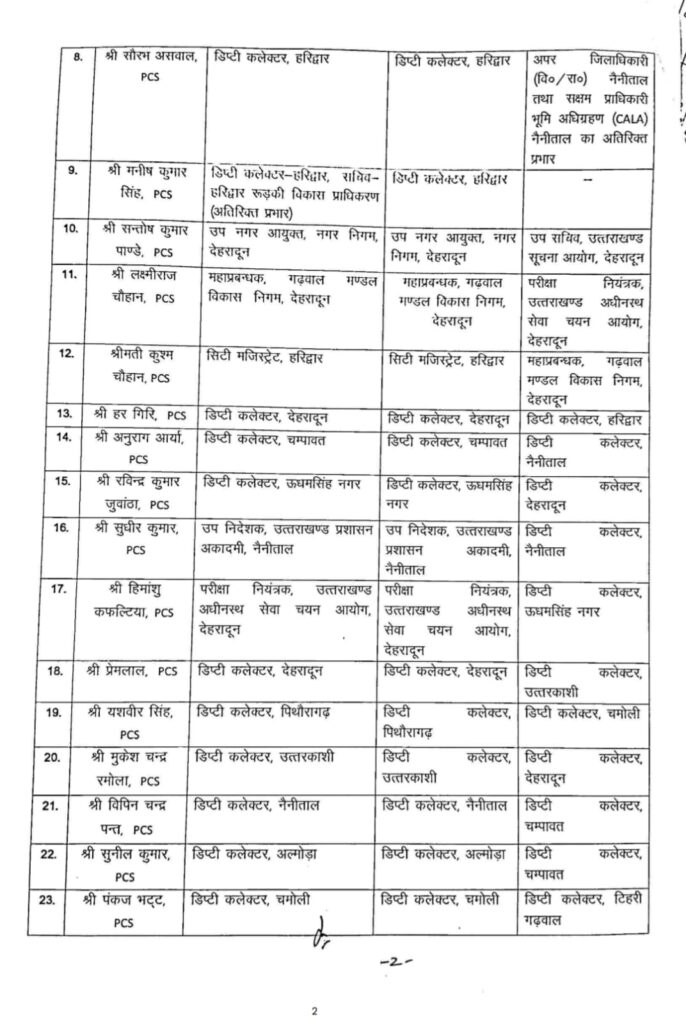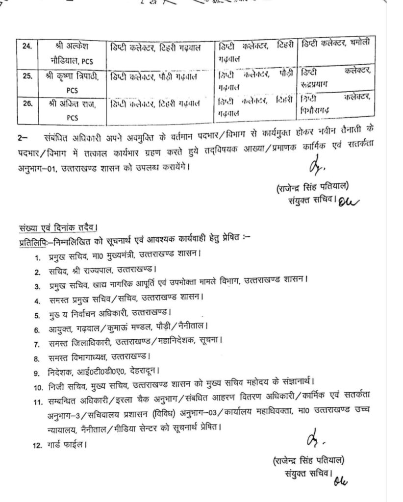 उत्तराखंड शासन ने बड़े स्तर पर प्रशासनिक फेरबदल करते हुए 26 पीसीएस और 6 आईएएस अधिकारियों के तबादले कर दिए हैं। इस संबंध में आदेश कार्मिक एवं सतर्कता विभाग द्वारा जारी किए गए हैं, जिसके तहत कई जिलों और सचिवालय स्तर पर अधिकारियों की जिम्मेदारियों में बदलाव किया गया है।
