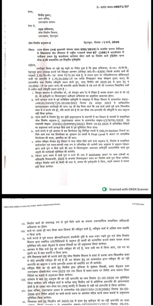 पहले चरण में पहाड़ कटान के लिए 1 करोड़ 75 लाख रुपये, दूसरे चरण में पार्ट-2 कार्य के लिए 4 करोड़ 69 लाख रुपये का शासनादेश जारी किया जा चुका है। वहीं तीसरे चरण में पुल निर्माण कार्य किया जाएगा, जिसकी लागत 11 करोड़ 77 लाख रुपये निर्धारित की गई है और इसकी भी स्वीकृति दे दी गई है।