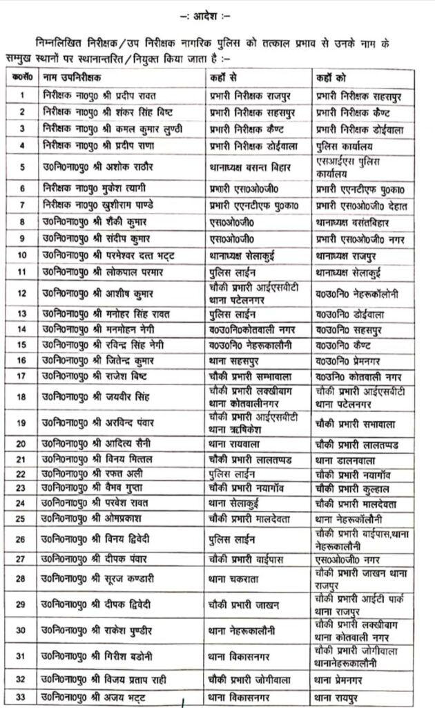 कुल मिलाकर देहरादून में पुलिस महकमे में किया गया यह फेरबदल प्रशासन की कार्यकुशलता बढ़ाने और जनसुरक्षा को सुदृढ़ करने की दिशा में एक महत्वपूर्ण पहल के रूप में देखा जा रहा है।